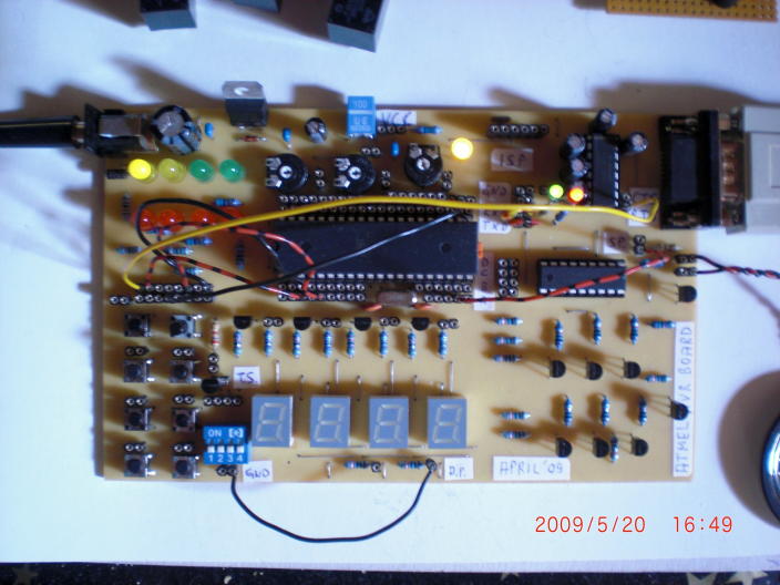 Komponenten des Testboards: - RS232-Schnittstelle (realisiert mit dem IC MAX 202 CPE) / RXD- u. TXD LED - Speaker - Anschluss, Temperatursensor KTY81-110 - LC-Display / Typ: EA W162B-N3LW (LCD 162C BL) - BCD zu 7-Segment-Decoder MC14513B / zusätzlich 7 Transistor - Treiberstufen zur Invertierung und Ansteuerung der Segment-Anzeigen (gemeinsame Anode) - vier 7-Segment-Anzeigen vom Typ SA39-11 - 7 Miniatur Taster u. ein Reset-Taster - 8 LEDs zur optischen Darstellung verschiedener Schaltzustände (4 rote, 2 gelbe, 2 grüne) - 3 Potenziometer / eines zur Einstellung einer variablen Referenzspannung (Uref.) - 4-fach DIP-Schalter (GND-Bezug) - diverse Steckkontakte (GND, VCC, VCCref., DIP-S., LEDs, TXD, RXD, CTS, RTS, ISP) - zusätzlich: Entwurf einer kleinen Relais-Bank (3 Relais, Versorgungsspannung: 5V) |