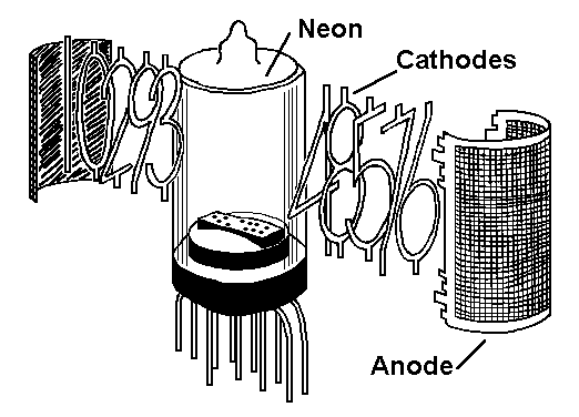 Anhand der Abbildung erkennt man 10 als Ziffern geformte Kathoden (-), die auf einem Die Anode (+) ist als metallenes Maschengefecht um die Ziffern gebogen. |
